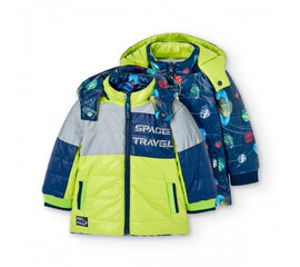 Διπλής όψης μπουφάν, με τρία χρώματα από τη μία πλευρά και ολόσωμο τύπωμα με πλανήτες από την άλλη, εξοπλισμένο με αποσπώμενη κουκούλα και τσέπες, κατασκευασμένο από 100% πολυεστέρα